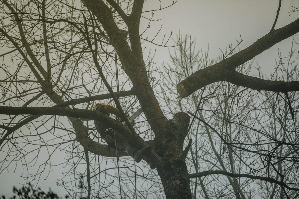 Abattage d’arbre avec rétention : les tronçons coupés sont retenus par un système de freinage adapté pour contrôler la vitesse de chute et la direction.