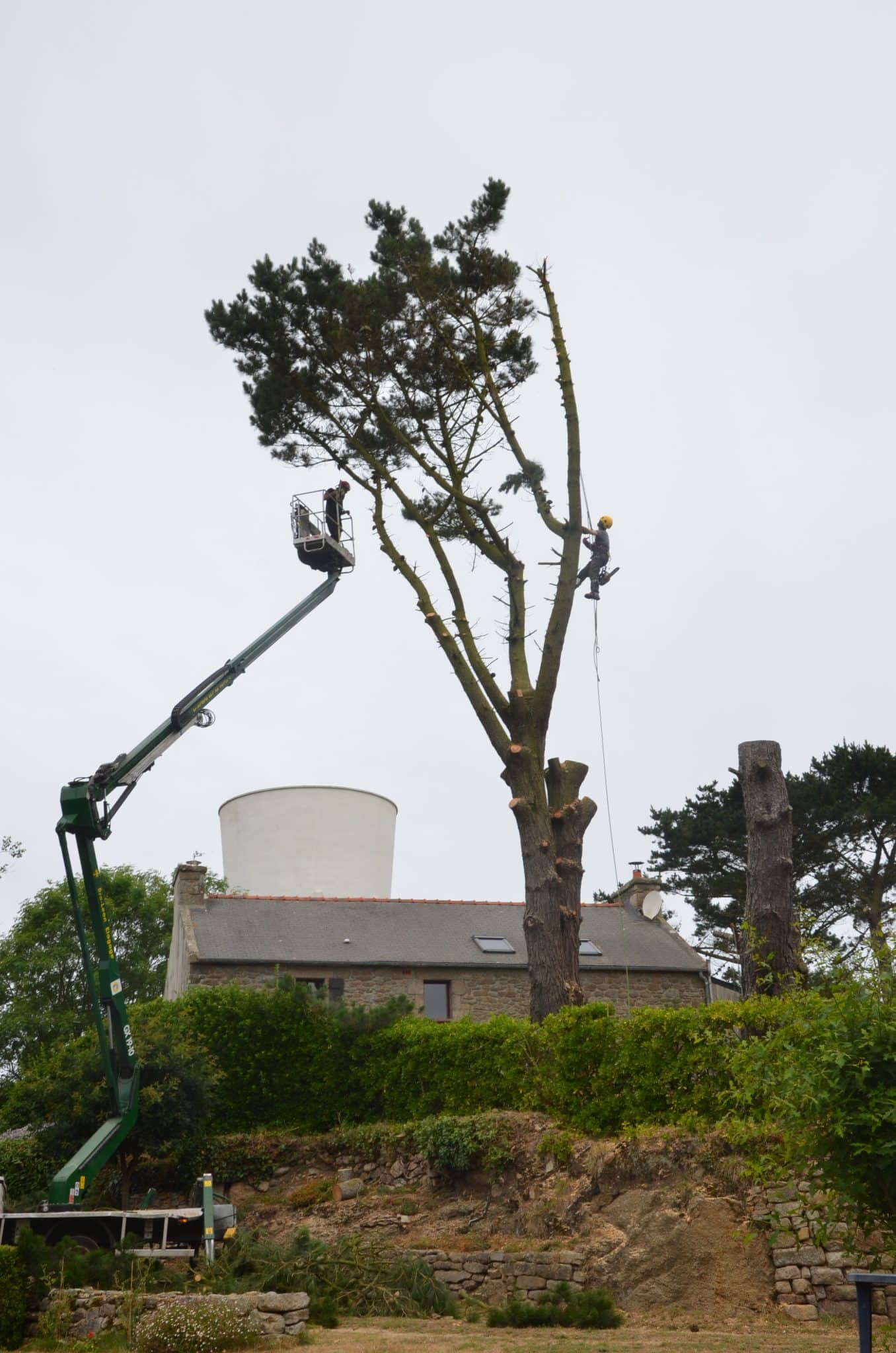 Cette opération peut être réalisée avec ou sans rétention. La rétention consiste à retenir les portions d’arbres démontés afin de les retenir et les diriger en douceur vers le sol ou l’aire de réception.
